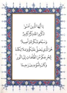ഖുർആൻ സൂറത്തുൽ അഹ്സാബിലെ 41, 42, 43 എന്നീ ആയത്തുകളാണ്. يَا أَيُّهَا الَّذِينَ آمَنُوا اذْكُرُوا اللَّهَ ذِكْرًا كَثِيرًا (41) وَسَبِّحُوهُ بُكْرَةً وَأَصِيلًا…
