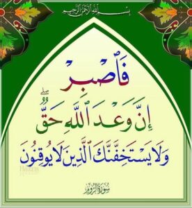 ഖുർആനിലെ 30-ാം അധ്യായമായ സൂറത്തു റൂമിലെ 60-ാം ആയത്താണ്. ഈ ആയത്തിൻ്റെ അർത്ഥവും വ്യാഖ്യാനവും താഴെക്കൊടുക്കുന്നു. ഖുർആൻ വാഖ്യം.. فَاصْبِرْ إِنَّ وَعْدَ اللَّهِ حَقٌّ ۖ…