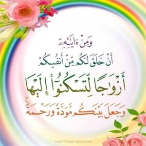 ഇത് സൂറത്തു റൂം-ലെ 21-ാം ആയത്താണ്. وَمِنْ آيَاتِهِ أَنْ خَلَقَ لَكُم مِّنْ أَنفُسِكُمْ أَزْوَاجًا لِّتَسْكُنُوا إِلَيْهَا وَجَعَلَ بَيْنَكُم مَّوَدَّةً وَرَحْمَةً ۚ…